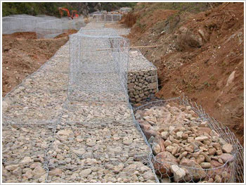 格賓石籠固腳拼裝及石料的裝填。格賓石籠固腳在平坦的地上上翻開網(wǎng)箱,鋪平。留意:施工時(shí)要留意佩帶護(hù)目鏡,手套等防護(hù)配備。格賓石籠固腳把每個(gè)面立起來,組合成一個(gè)網(wǎng)箱狀。網(wǎng)箱的每一個(gè)外表都有較粗的邊絲,在網(wǎng)面的邊角把這些重合的粗邊絲相互擰在一起。這些擰在一起的邊絲在邊角和綁絲重合。